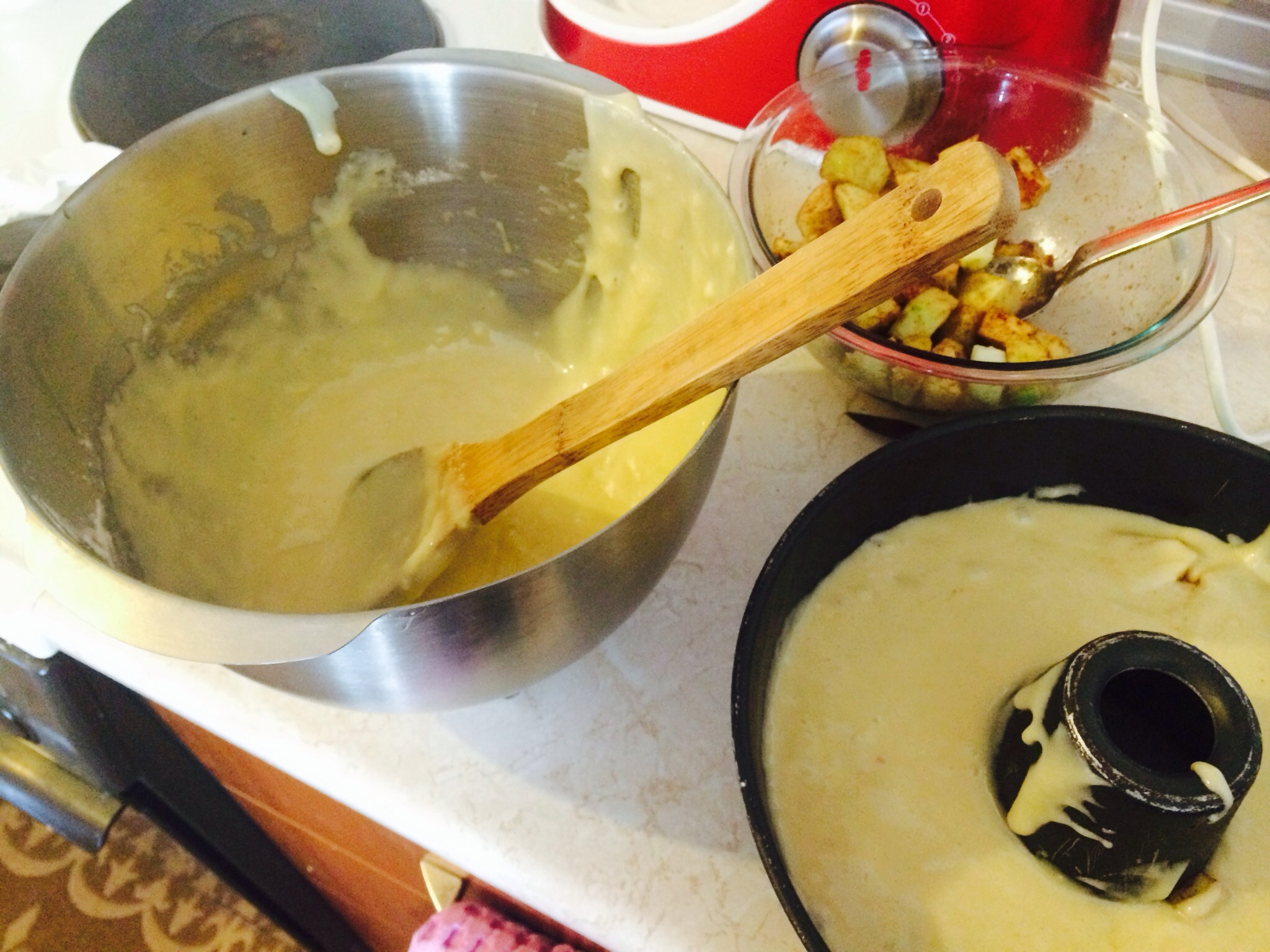 - Αφού βουτυρώσω και αλεύρωσω μια φόρμα, λειτουργώ ως εξής: βάζω μια στρώση ζύμης, μετά μια στρώση μήλα, συνεχίζω με στρώση ζύμης, ξανά μια στρώση μήλα, μέχρι να τελειώσουν και τα δυο μείγματα.