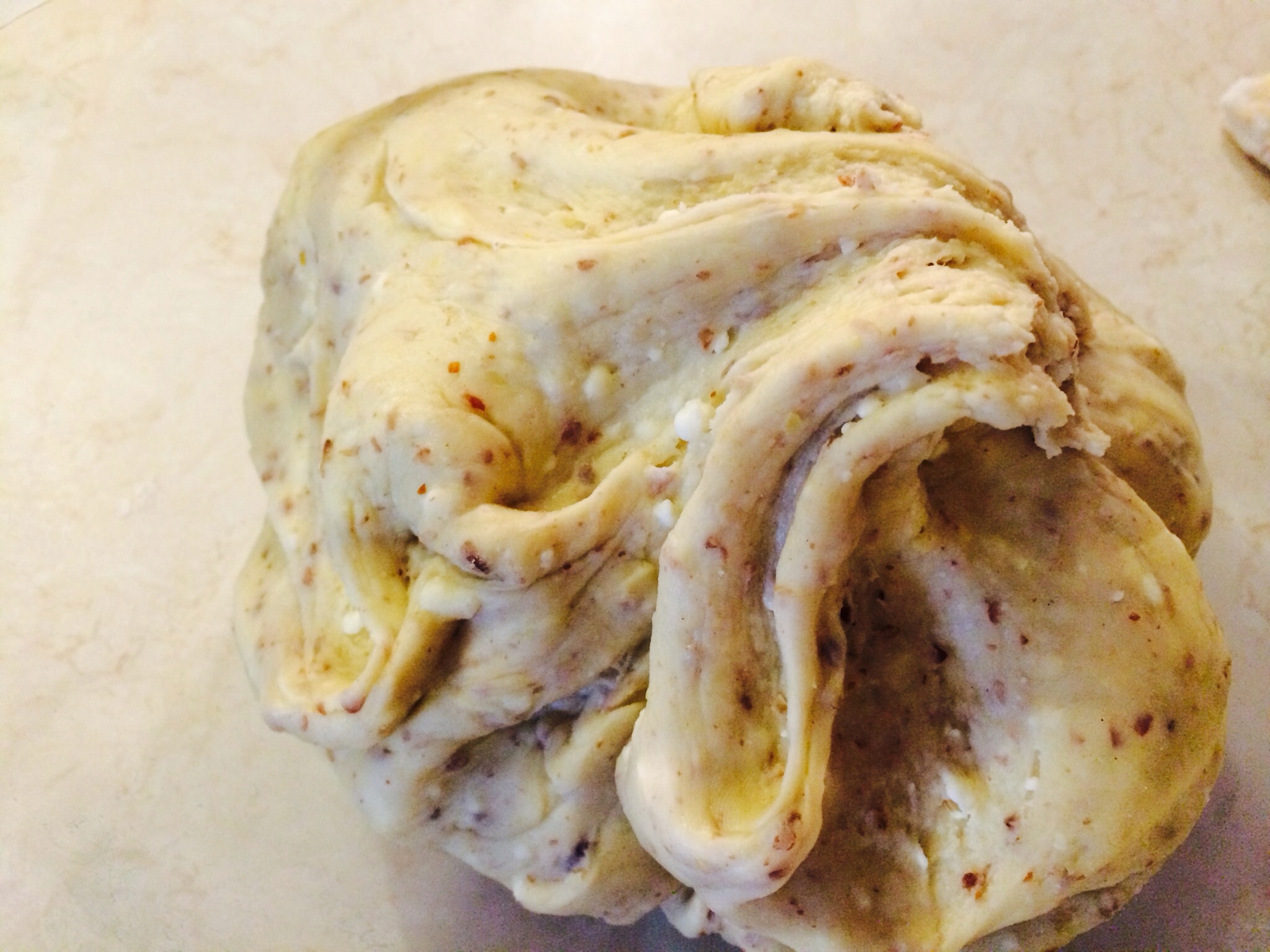 Λιώνω το βούτυρο και ρίχνω μέσα το λάδι, τη μαγιά, τη ζάχαρη, το αλάτι και μια κουταλιά αλεύρι. Στο μπωλ του μίξερ τρίβω τη φέτα κ προσθέτω το λιναρόσπορο. Ρίχνω το μίγμα της μαγιάς μέσα κ αρχίζω να χτυπάω σε μέτρια ταχύτητα. Στη συνέχεια ρίχνω εναλλάξ το αλεύρι με το ζεστό νερό, μέχρι να εχω μια ζυμη που να δείχνει κάπως έτσι: