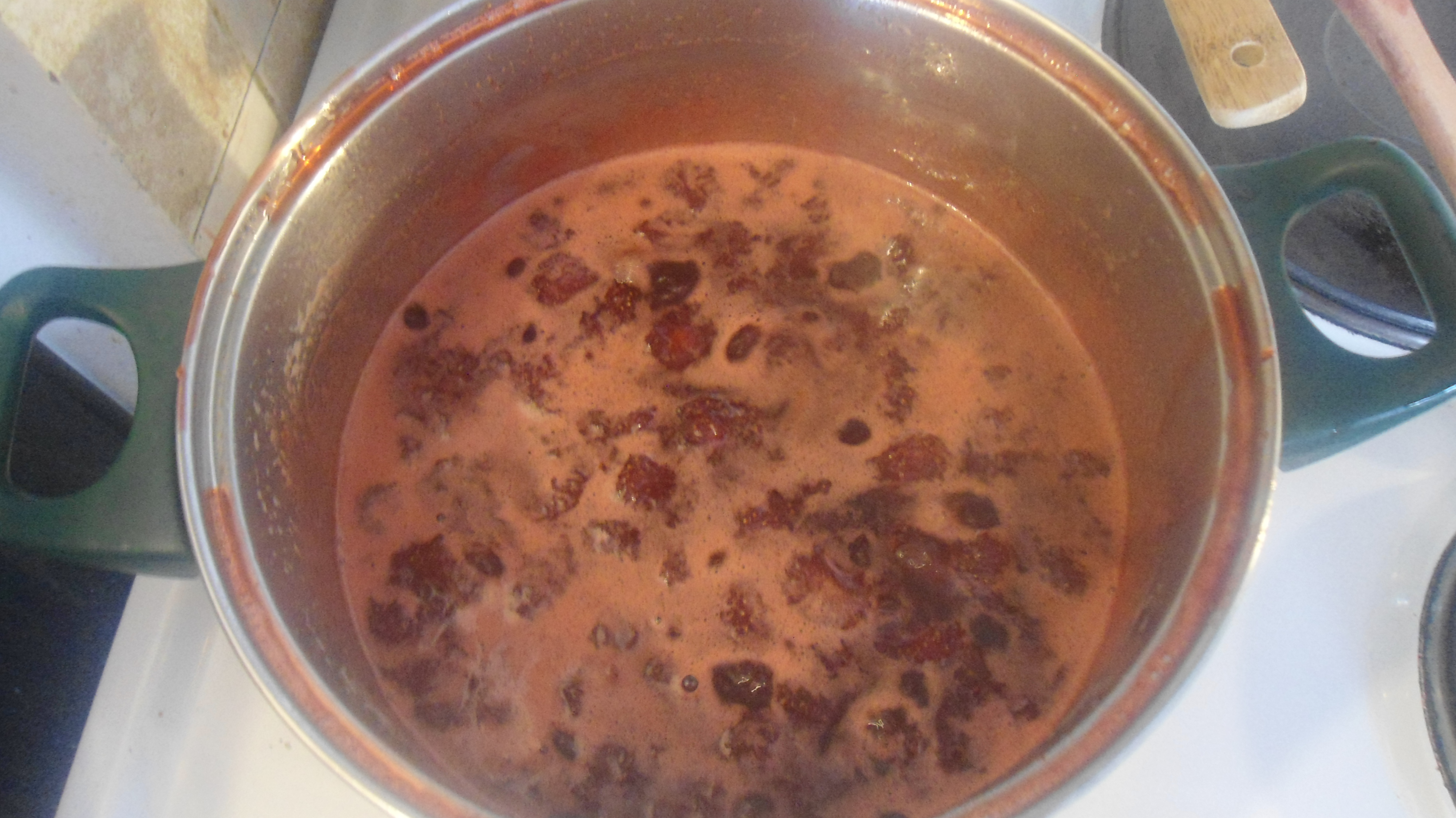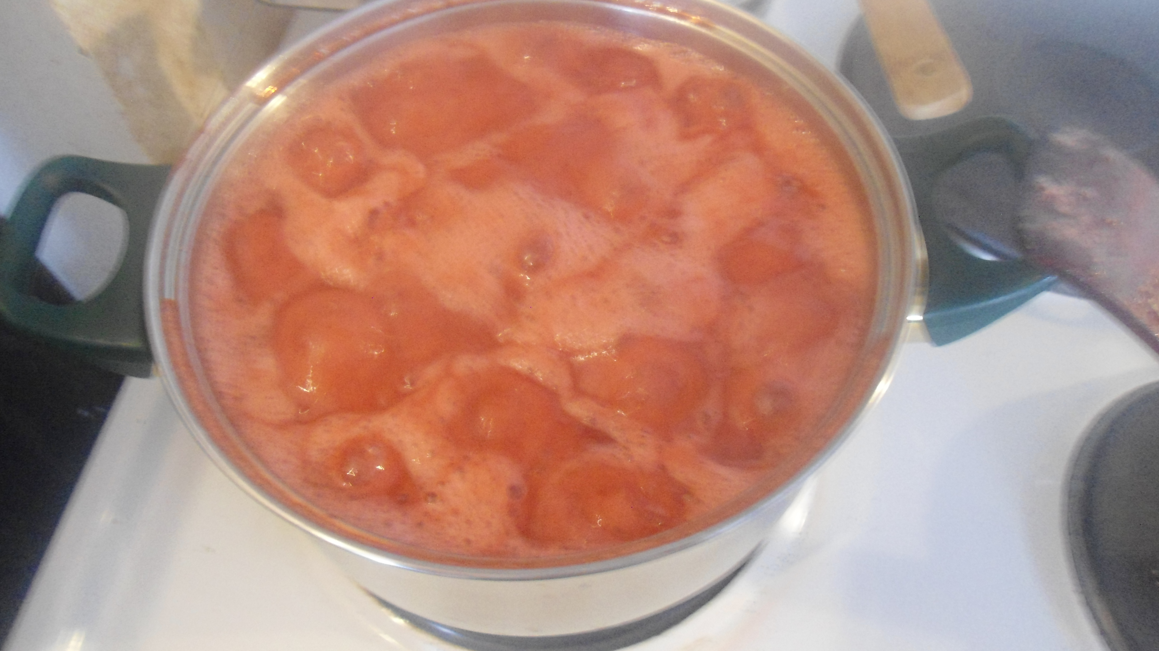Εδώ λοιπόν είναι που θα μοσχοβολήσει το σπίτι σας ευωδιές κι αρώματα!! Τη βάζω να βράσει, αρχικά σε πάρα πολύ υψηλή θερμοκρασία, και στη συνέχεια την αφήνω σε χαμηλή θερμοκρασία. Περίπου στο μισό της δύναμης του ματιού της κουζίνας σας. Αυτό θα γίνεται για κάποια ώρα, μέχρι να μαραθεί το φρούτο – δεν σας λέω ώρα, γιατί εξαρτάται από πολλούς παράγοντες. Θα σας δείξω όμως πως πρέπει να είναι. Αρχικά θα φουσκώσει, κάπως έτσι: