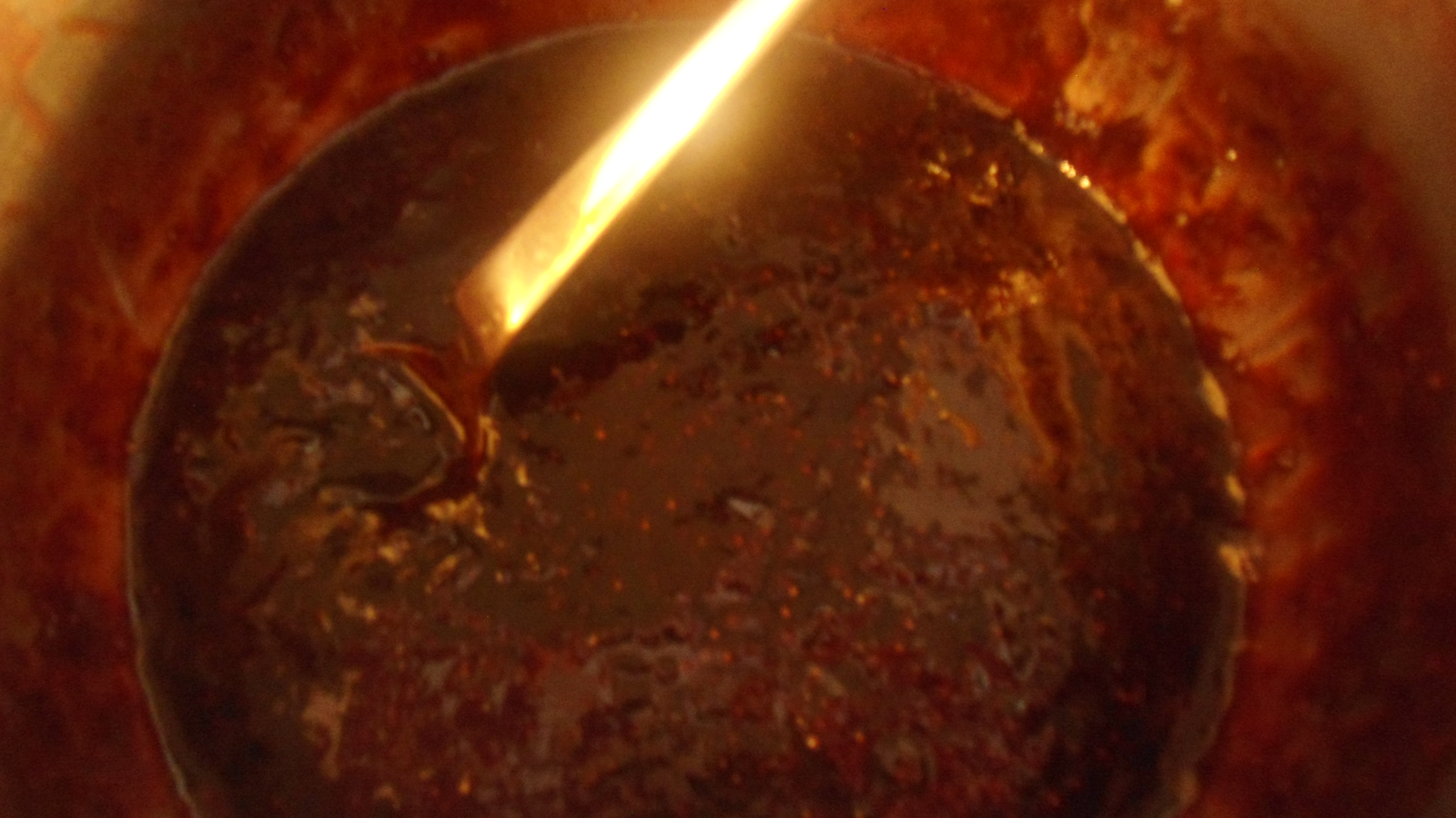 Τώρα λοιπόν θα πρέπει να ξανά αυξήσω τη θερμοκρασία, όχι όμως στο τέρμα, μέχρι η μαρμελάδα μου να δέσει. Αυτό θα το καταλάβετε γιατί ανακατεύοντας με την κουτάλα, θα αρχίσουν οι σταγόνες του υγρού να γίνονται πιο χοντρές. Σβήνω το μάτι, και η μορφή της θα είναι κάπως έτσι: